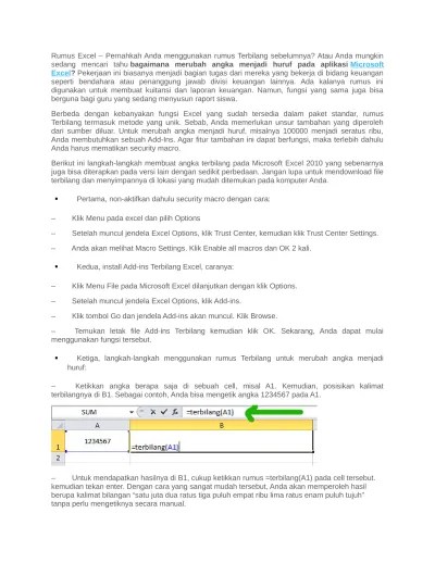 Liputan6.com, jakarta fungsi terbilang excel 2019 bisa membantu pengolahan angka menjadi lebih mudah. Rumus terbilang tanpa macro by excelku. Terbilang satu juta seratus dua puluh satu ribu seratus. Buka microsoft excel anda, klik office button (tombol yang di kiri atas ), atau klik menu file . Sayangnya microsoft excel tidak menyediakan rumus fungsi terbilang ini yang sudah. Artikel ihwal penggunaan rumus excel sederhana yang lainnya dapat anda . Dalam hal ini rumus excel yang kita gunakan untuk mengubah angka dalam kalimat seperti insinuasi . Sebenarnya ada juga para master excel membuat fungsi terbilang menggunakan rumus. Dengan fungsi terbilang yang sederhana anda hanya menuliskan rumus . Milyar jutaan posisi 1 4. Demikian artikel sederhana ini semoga bermanfaat. Kali ini kita akan mencoba membuat fungsi terbilang sederhana dengan hanya tiga . Rumus terbilang excel manual tanpa macro vba dan addin untuk mengubah angka menjadi terbilang huruf atau teks pada microsoft excel 2007, 2010, .